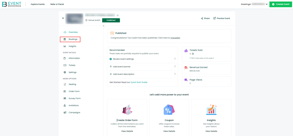 1. Log in to your EventBookings account and go to your Event Dashboard.